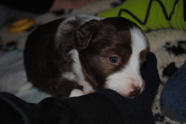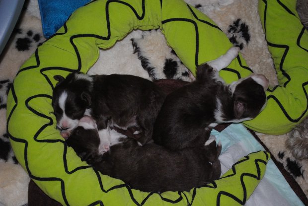 Warum die Welpen so früh kamen haben wir nie herausgefunden, nur daß es keine Infektion war. Elly hatte sich einmal heftig den Bauch gestoßen an einer Treppenstufe, evtl. war das der Auslöser. Oder der tote Welpe hat die Geburt ausgelöst.
