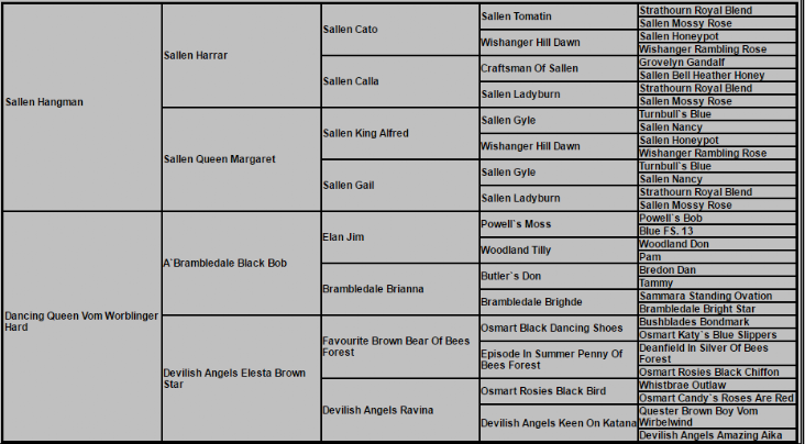In seinen Ahnen vereinen sich Linien, die hierzulande kaum zu finden sind: über die mütterliche Seite die alte Osmart Linie und Brambledale mit Einkreuzung von Working Beardies (in 3.er Generation Elan Jim, in 4.er Generation Butler's Don, wiederum ein Enkel von Turnbull's Blue), über die väterliche Seite die Sallen Linie, auch hier Working Beardie-Anteil (in 5.er Generation Turnbull's Blue).