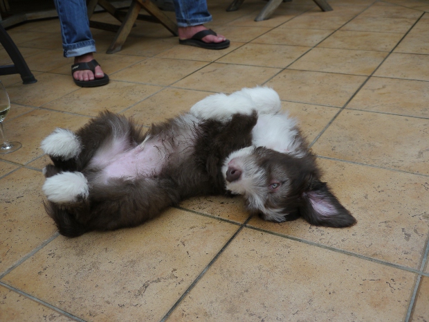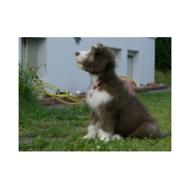 Louis ist der einzige braune Rüde im Wurf. Seine Familie hat sich sofort in ihn verliebt. Er sah immer ein bißchen lustig aus, als hätte er eine Brille an und irgendwie grimmig. Dabei war er das gar nicht. Er kam mit vollständig pigmentiertem Näschen zur Welt, war immer sehr agil und mutig.